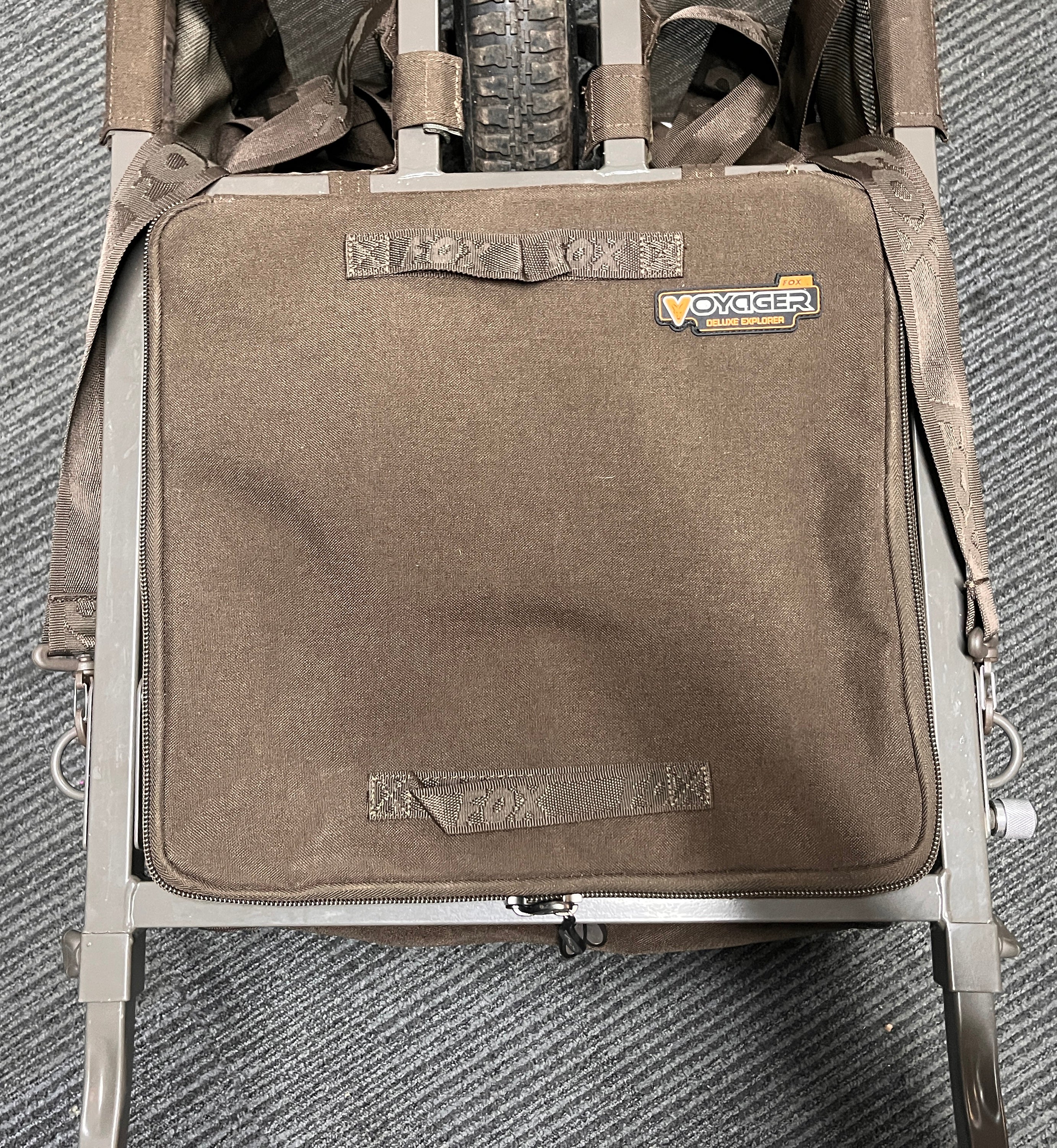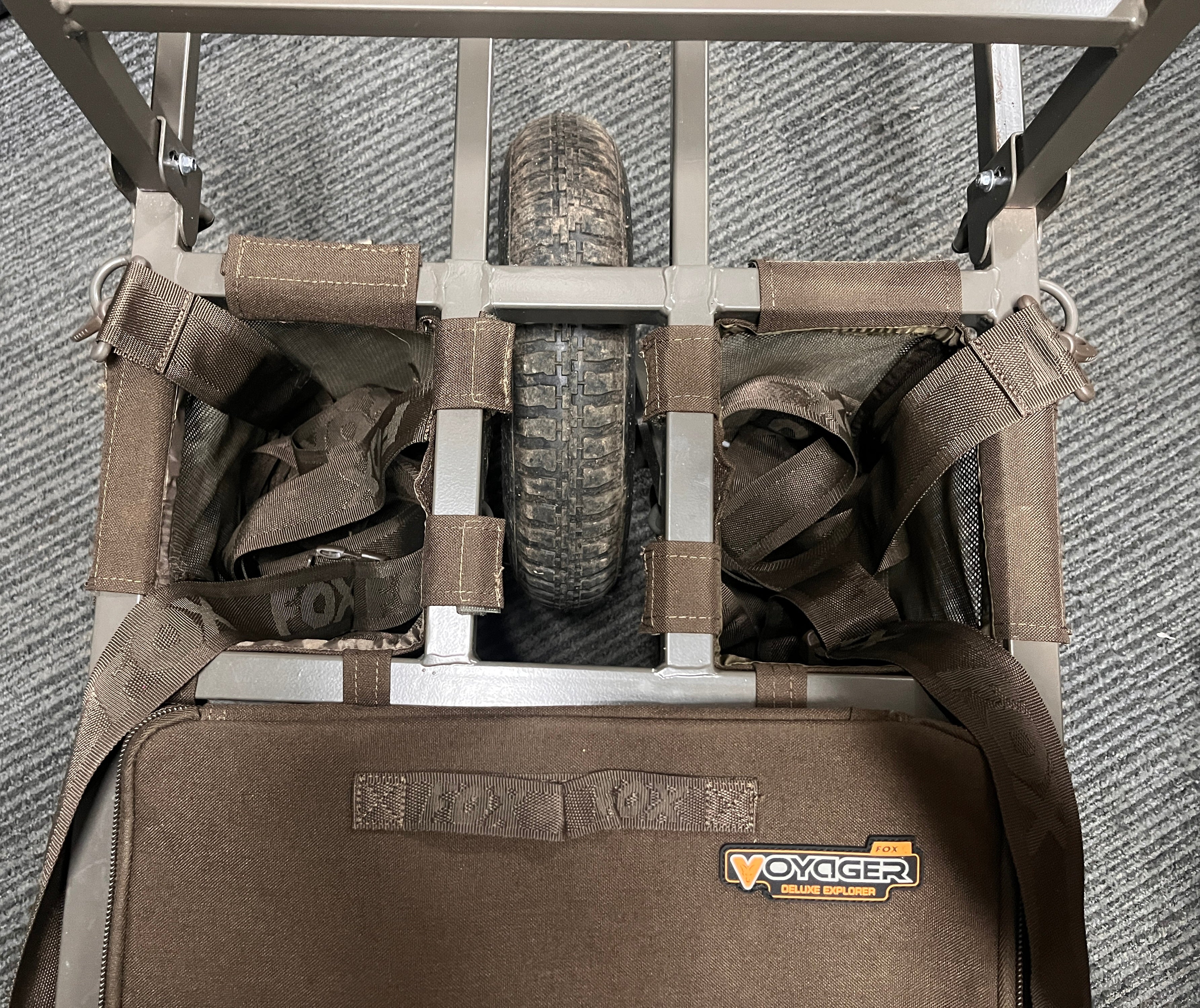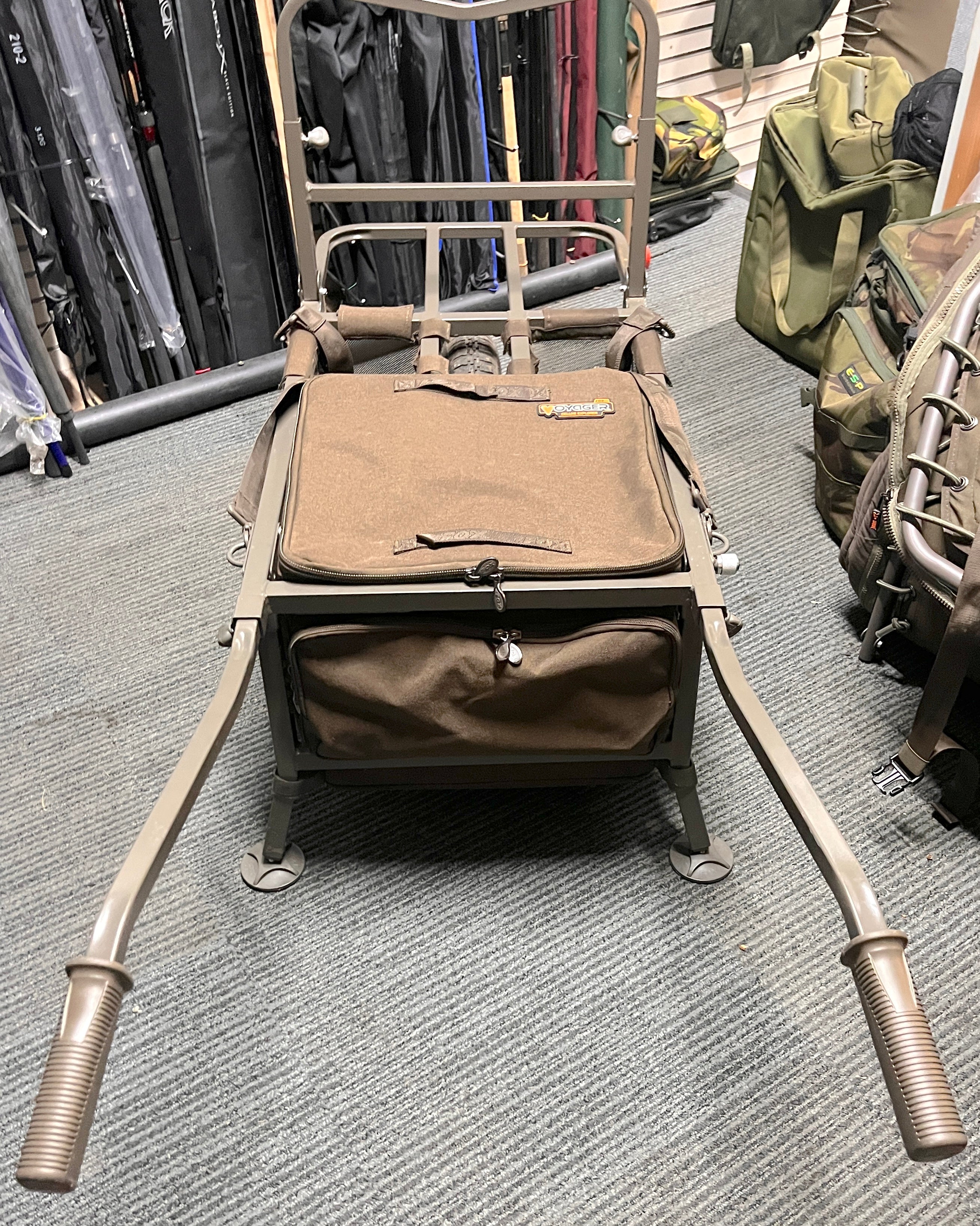 - Features extendable front barrow bag rack – this allows the Voyager or Camolite Compact Barrow Bags or Low Level Bags (all available separately) to sit right at the front of the barrow when using the barrow in ‘session mode’ and carrying a bedchair. However, when fishing day sessions without a bed, simply retract the front rack and turn the Barrow/Low Level Bags around so they face you. The design ensure the barrow remains balanced whether in short or long session mode