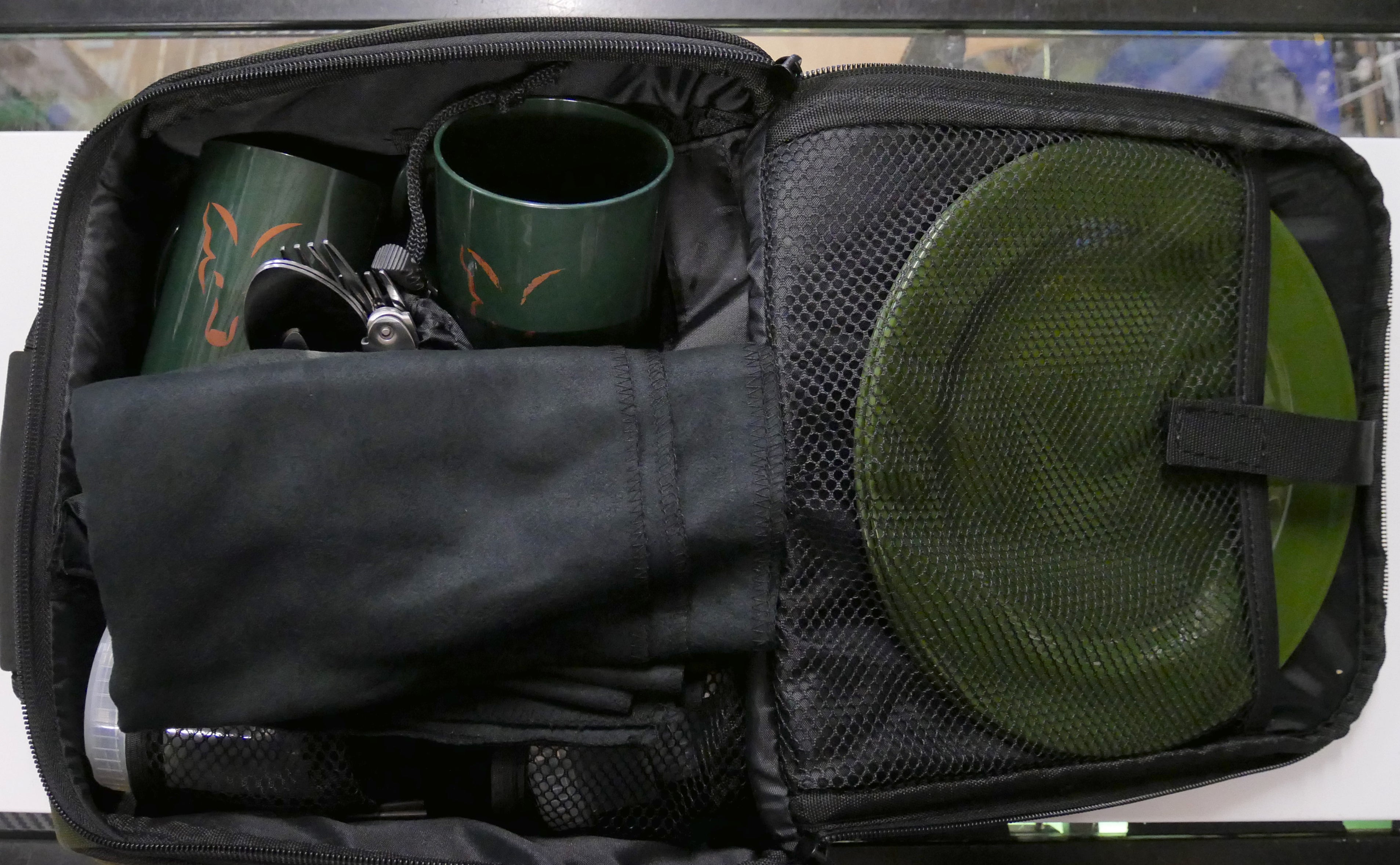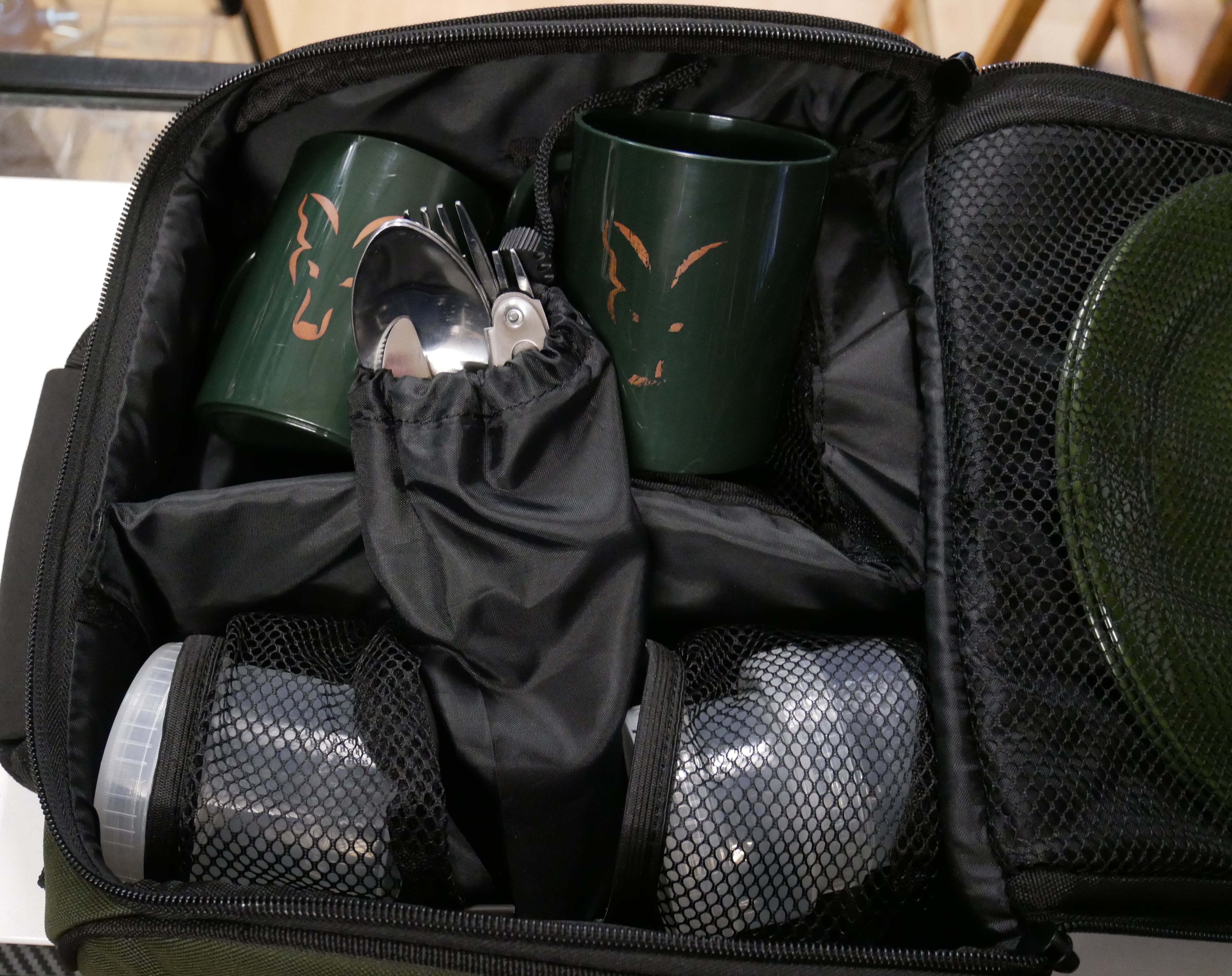 - Supplied with: 2 x stainless steel knives, forks, spoons and teaspoons, 2 x round green plates, 2 x green mugs, 1 x Corkscrew, 1 x large screw top tubs, 2 x small screw top tubs, 1 x Micro fleece towel