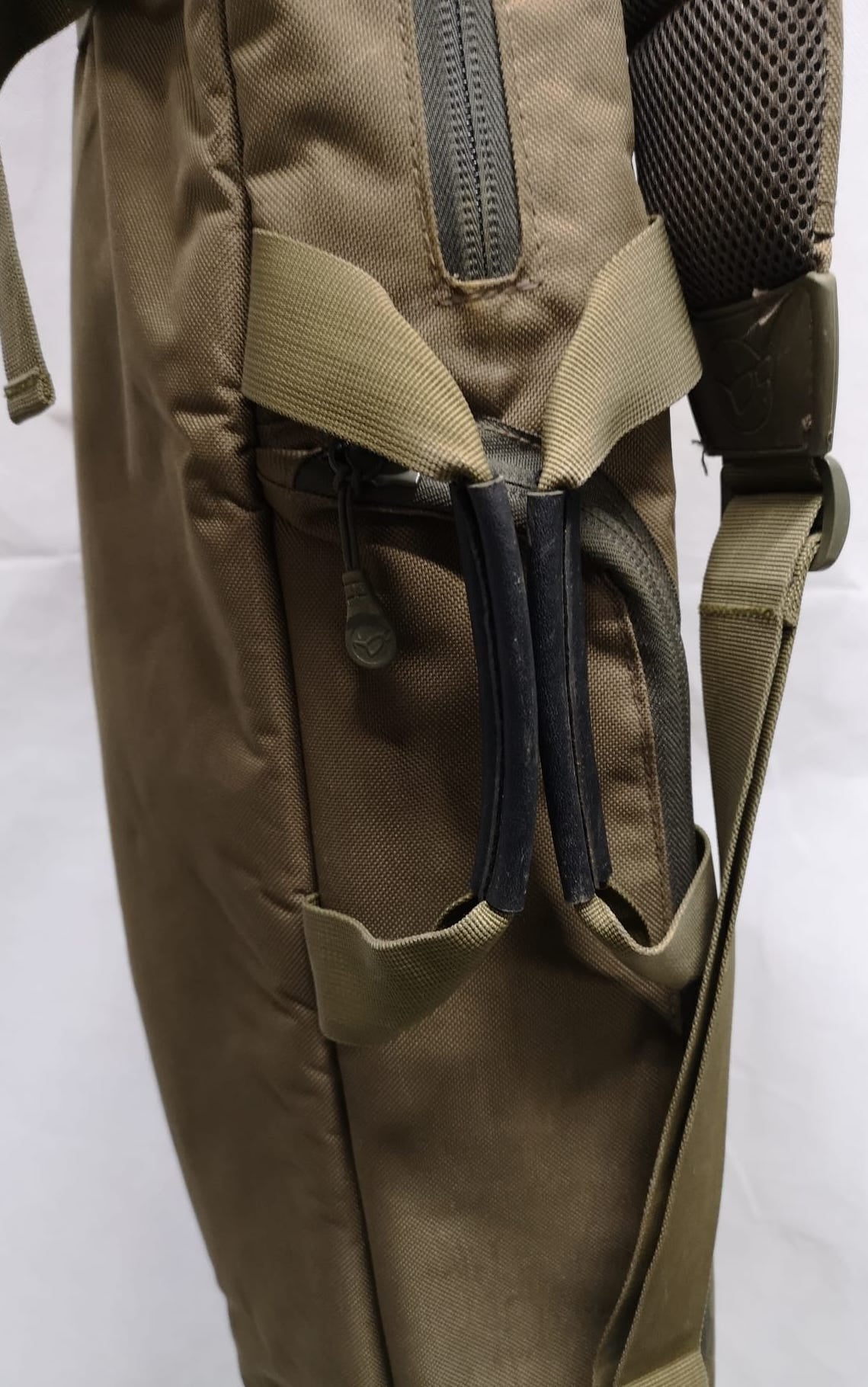 - Pockets on the spine to hold storm poles, banksticks and a landing net
